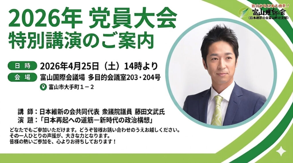 今日本は、先進国の中で「一人負け」状況にあります。しかし、我が国にはまだまだ地域や民間に底力が残っています。それを引き出し、国民が自信と誇りを取り戻し、他国の人が羨むような日本をもう一度創らなければなりません。 そのためには、従前の小手先の改革や弥縫策の連続ではなく、これまでにない大胆な発想や手法で統治機構、社会保障、税制、規制の諸改革を断行しなければなりません。 日本維新の会は、既得権にまみえず、しがらみがない立場で我が国の改革を「前へ前へ」と積極的に進めていきます。 ここ富山から日本大改革を実現する意気込みで、政治の刷新に取り組んで参ります。 皆様のご支援ご協力を賜りますよう心からお願い申し上げますぜひお力をお貸し下さい。